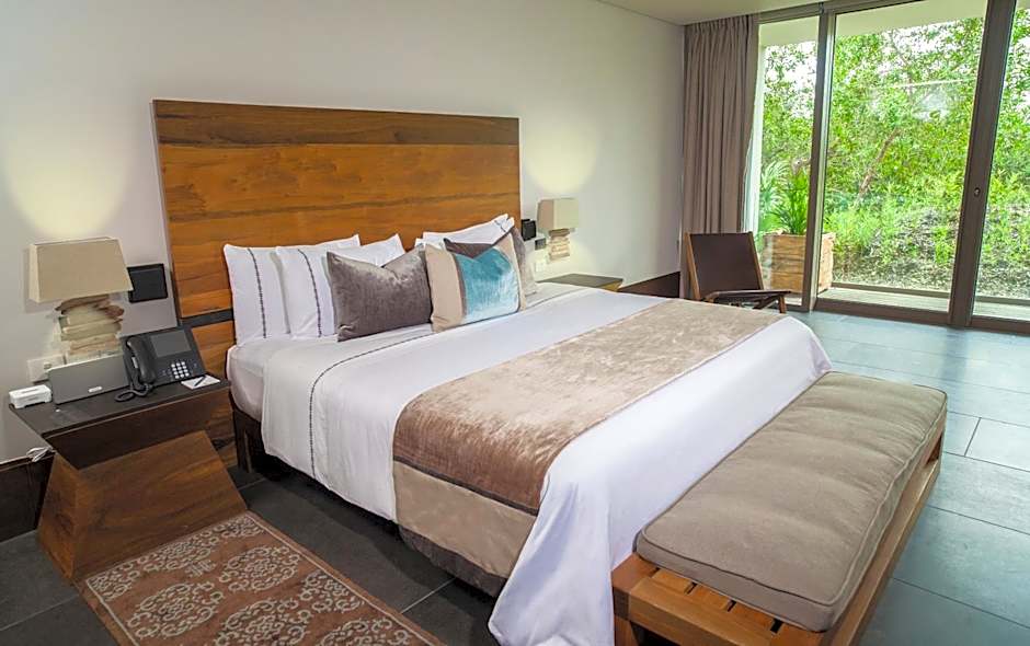 Floor-to-ceiling windows open onto an inviting terrace with ocean views. Suites are located on the first to fifth levels in the residence area. This suite features a king size bed, a Nespresso coffee maker, a mini-bar and flat-screen TV. The spacious bathroom features a bath tub with rainfall shower and amenities like bathrobes, slippers and free toiletries.
